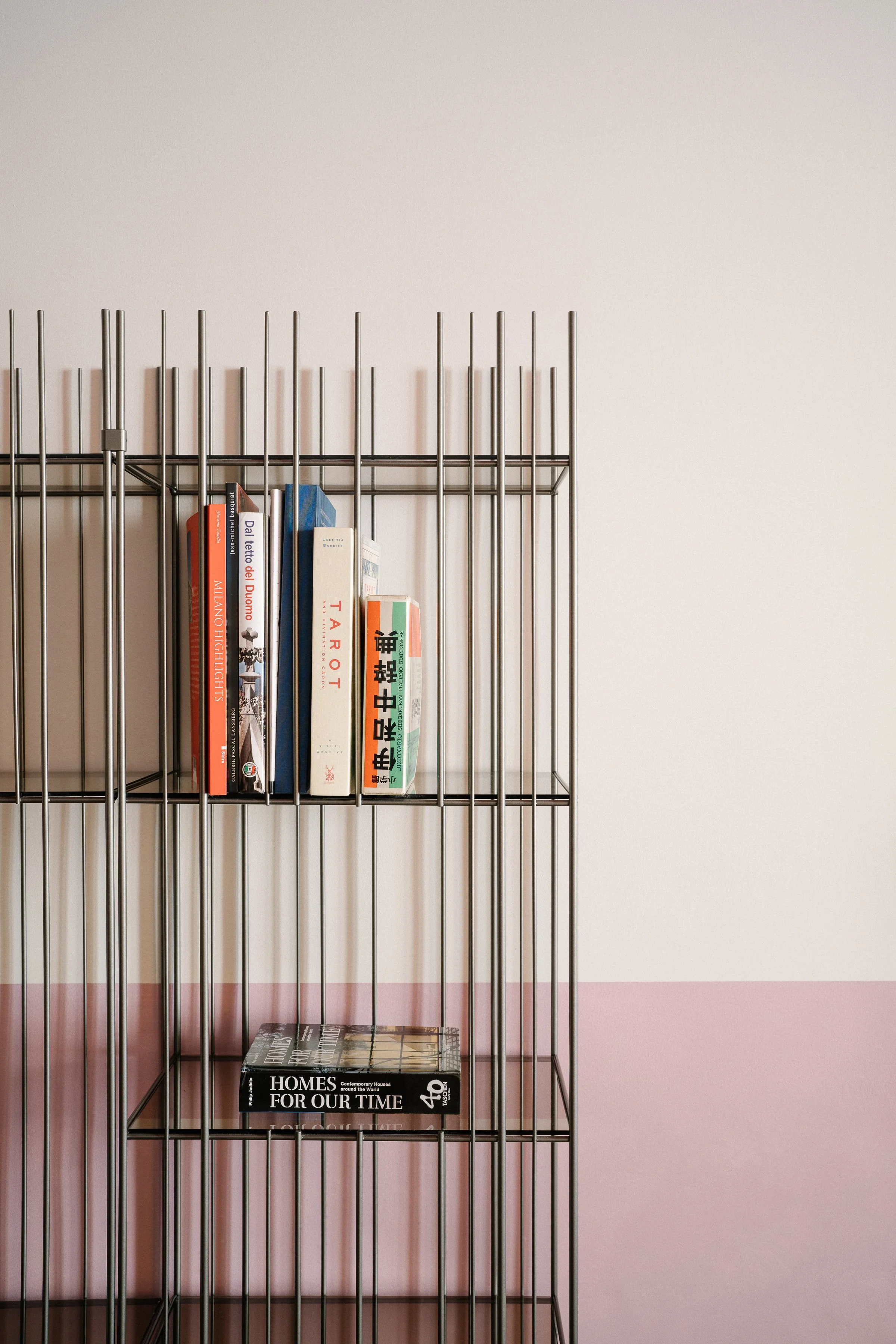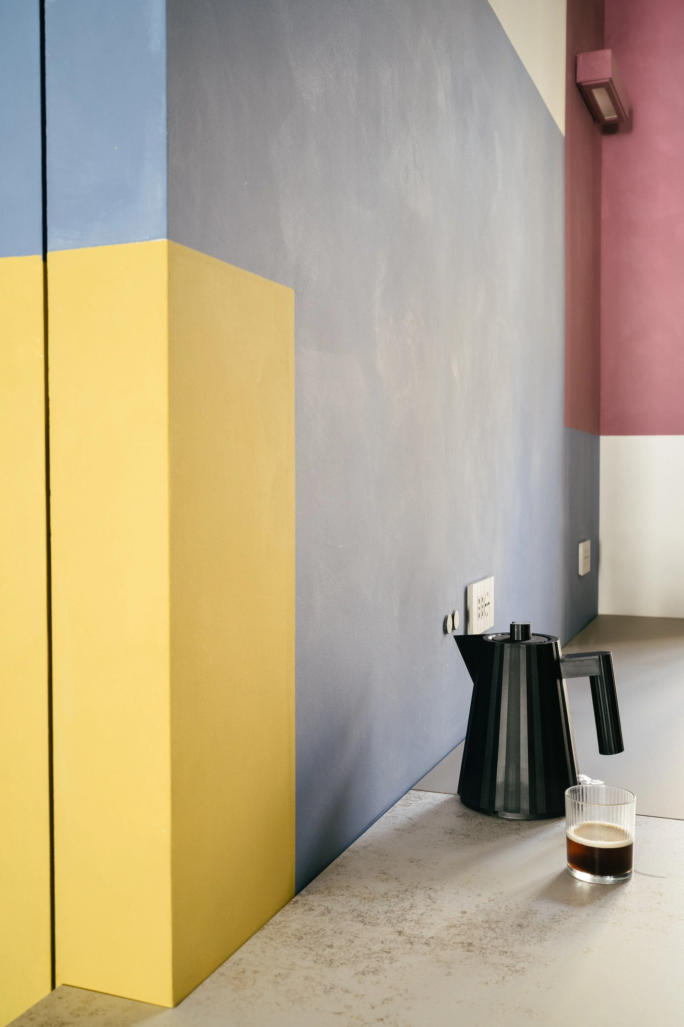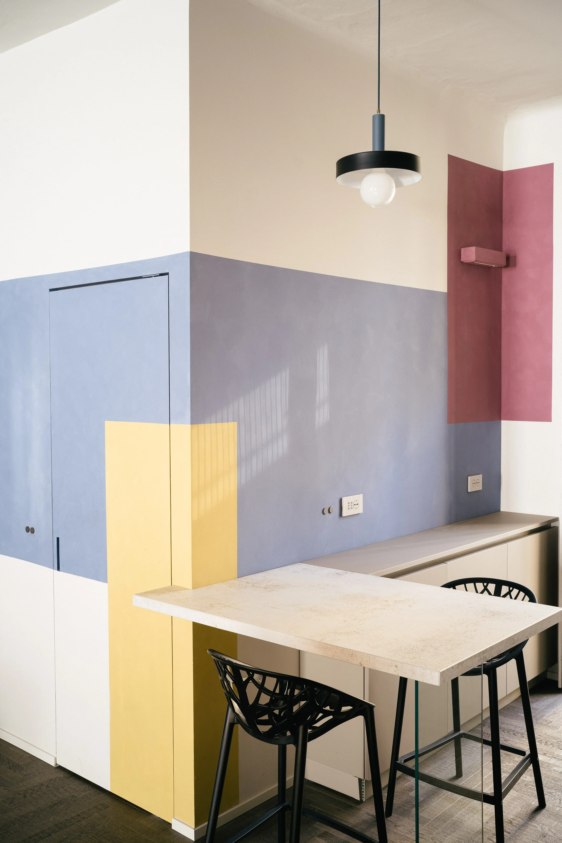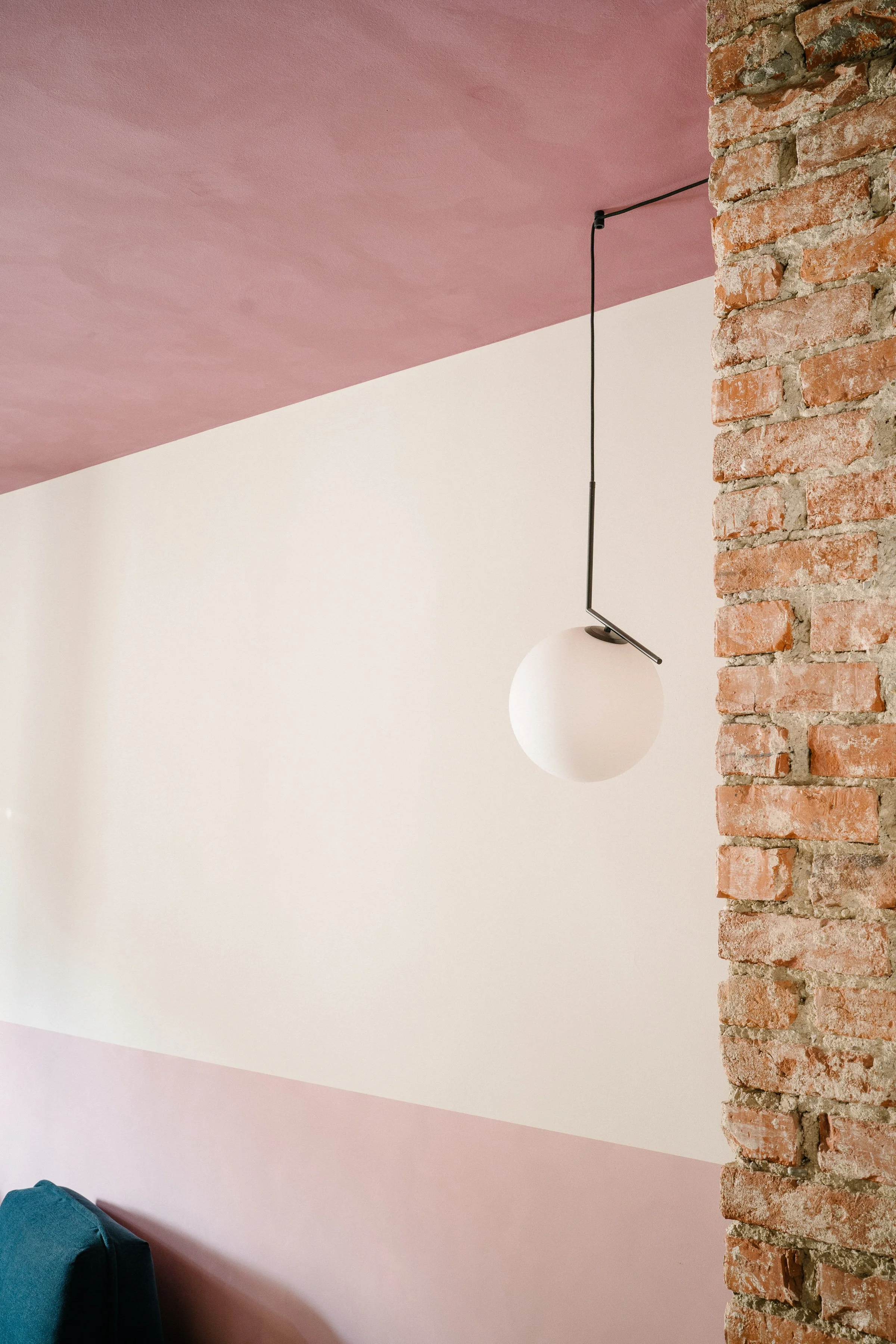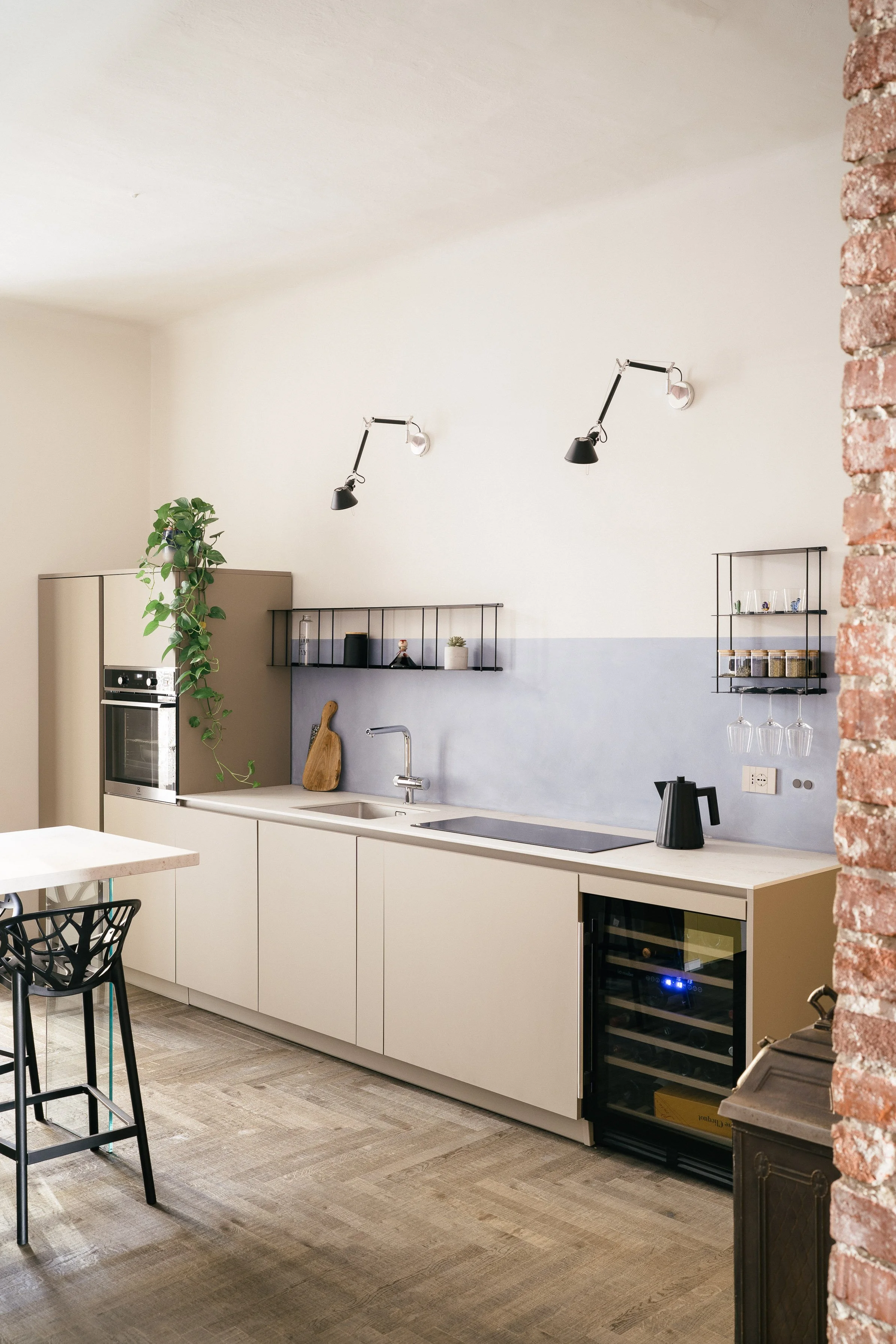 Un interno dove il colore diventa architettura. Bande a mezza altezza in azzurro polvere, rosa cipria e giallo ocra disegnano funzioni e prospettive, dialogando con i mattoni a vista e il parquet a spina. La cucina lineare è essenziale e luminosa: piani chiari, dettagli neri, mensole in metallo e lampade orientabili costruiscono un segno grafico, mentre porta-calici, cantinetta e contenimenti su misura ottimizzano l’uso quotidiano. Nel living volumi bassi e tessuti pieni definiscono un’area morbida e accogliente, valorizzata da intonaci vellutati e luce diffusa. Il progetto lavora su stratificazioni leggere e materiali sinceri, trasformando un ambiente esistente in una casa contemporanea, funzionale e fortemente personale.
