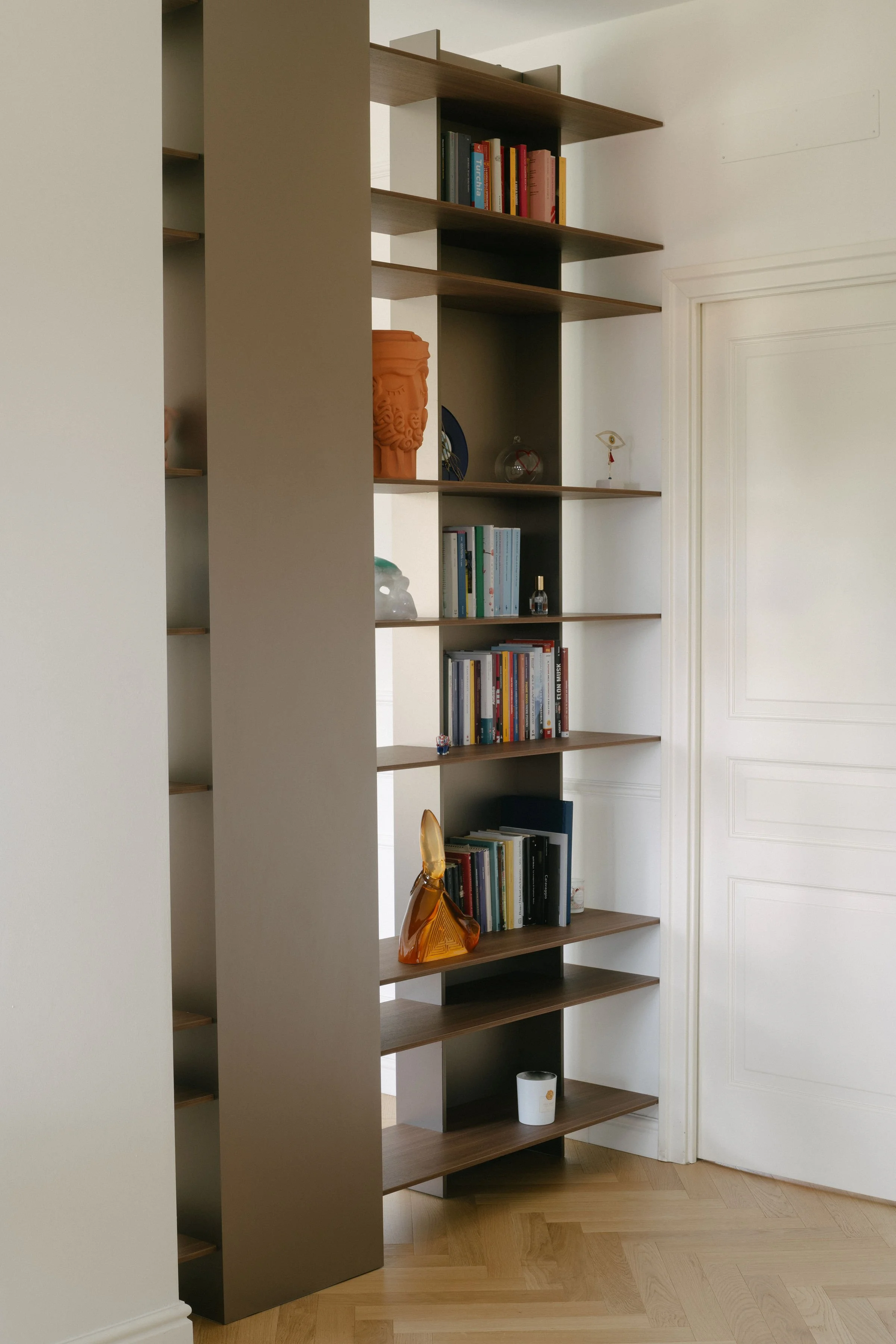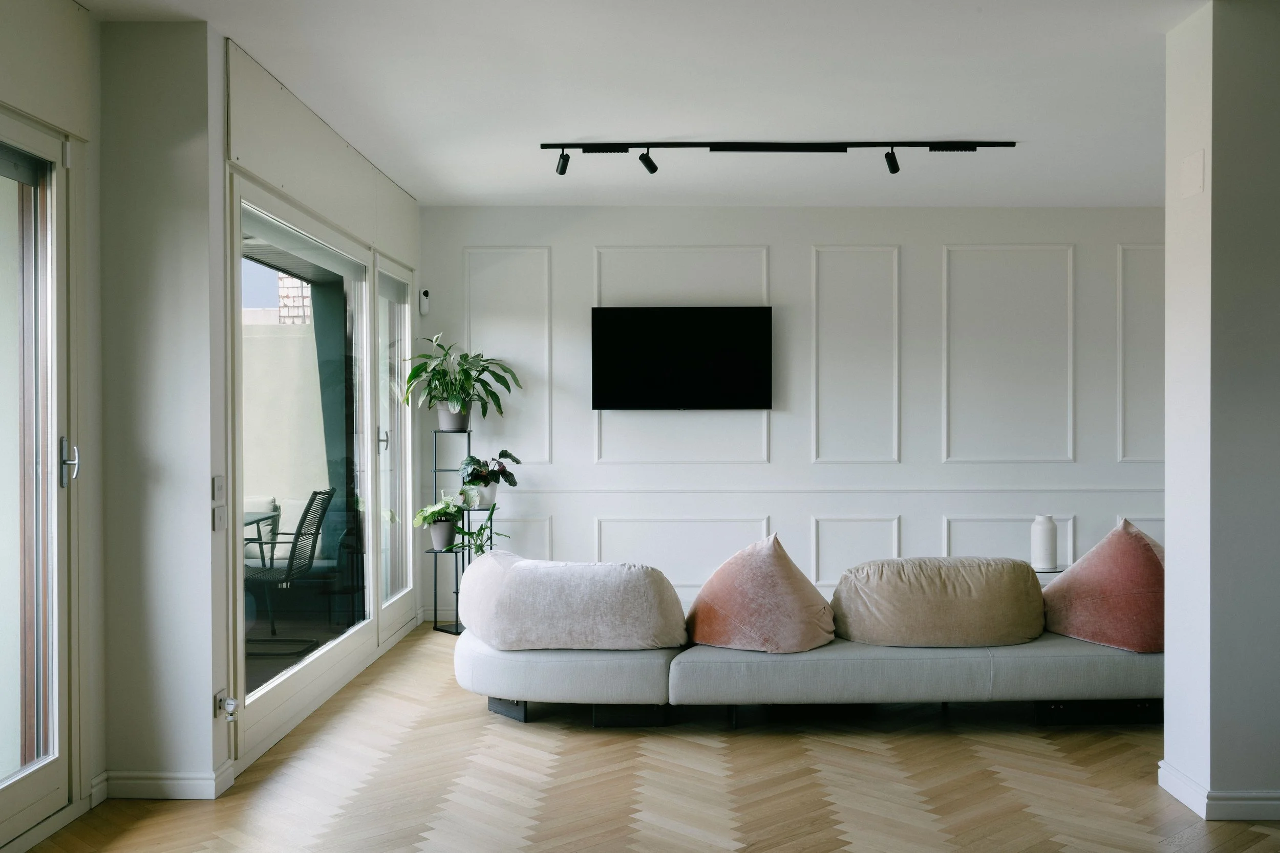 Luce naturale, linee essenziali e materiali autentici definiscono questo interno contemporaneo. Un pavimento in rovere a spina di pesce unifica gli ambienti, mentre boiserie e volumi su misura scandiscono le funzioni. La cucina è un blocco scultoreo: isola in pietra chiara, colonne integrate e fondale dogato in legno, con sospensioni cilindriche che disegnano la scena. I bagni alternano caratteri: uno monolitico in marmo verde con rubinetteria ottone satinato, l’altro più leggero con piano color terracotta, specchio ad arco e luce diffusa. Nel living, una parete modellata da cornici classiche dialoga con un divano morbido e cuscini in toni polverosi; una libreria a giorno organizza libri e oggetti. All’esterno, una piccola terrazza verde salvia prolunga la casa tra essenze mediterranee. Palette neutre, inserti di verde e accenti caldi costruiscono un’atmosfera calma e tattile, dove funzionalità e comfort guidano ogni dettaglio progettuale.