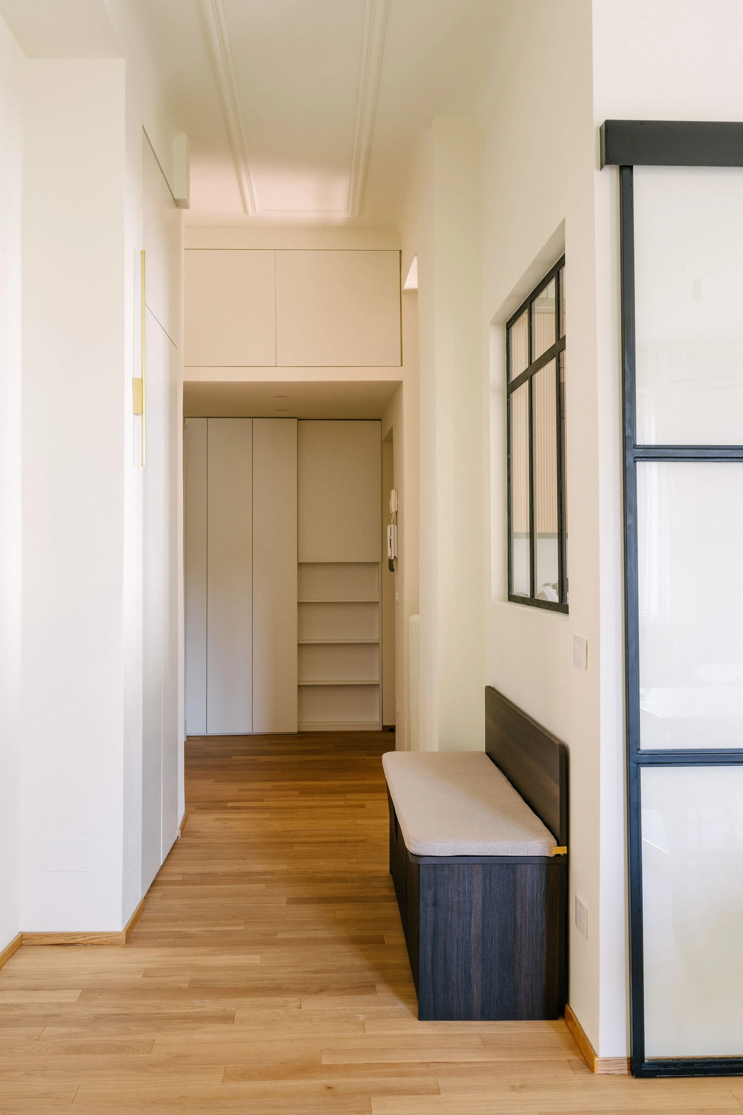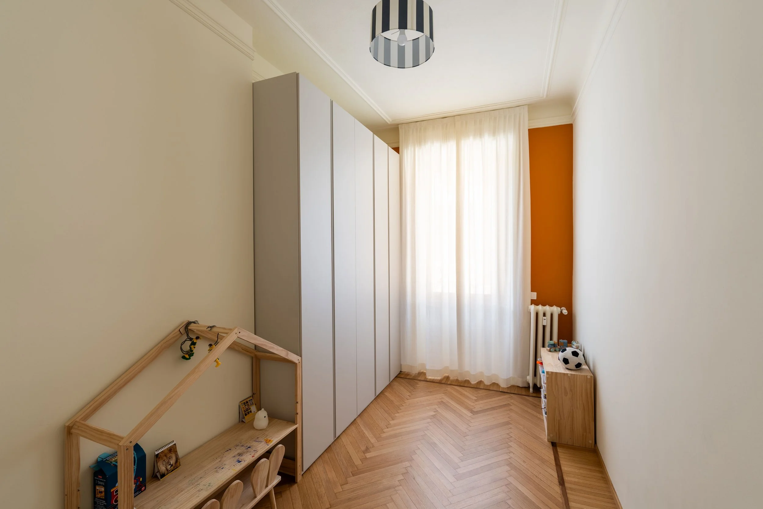 Riprogettazione di un appartamento con altezze importanti, pensata per far scorrere la luce e moltiplicare lo spazio utile. Un grande living ospita tavolo e salotto; la cucina è filtrata da una vetrata in ferro e da pannelli scorrevoli. Il rovere unifica la casa con pose a spina e a listoni, mentre pareti avorio, tende leggere e dettagli in ottone disegnano un’atmosfera calda e contemporanea.La progettazione su misura razionalizza ogni passaggio: armadiature a tutta altezza nell’ingresso e nei disimpegni, panca contenitore, libreria metallica a giorno e schermature dei radiatori. Nella zona notte, colori pieni e calibrati – dal verde salvia all’arancio – dialogano con arredi in legno naturale; le camere dei bambini privilegiano funzionalità e gioco, con elementi semplici e durevoli.Il risultato è un interno essenziale ma accogliente, dove la memoria delle finiture tradizionali incontra linee pulite e soluzioni capaci di migliorare la vita quotidiana.